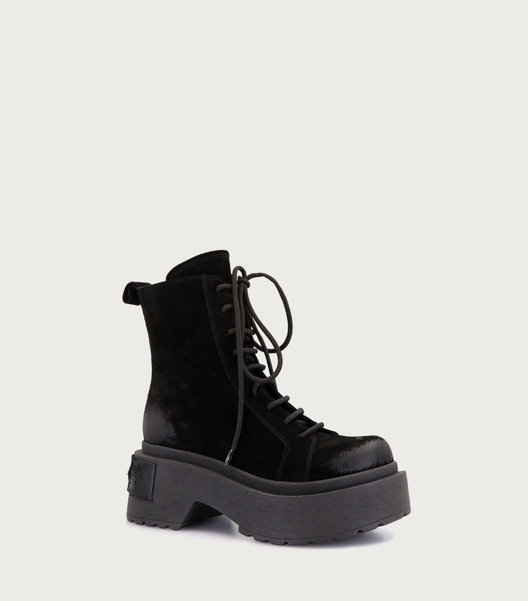 Borcego Eddie negro. Modelo confeccionado en gamuzón con diseño moderno y detalles diferenciales. Presenta forrería de fibras animal friendly y base inyectada con aplique de cuero y herraje posterior. Altura de taco de 6 cm, plataforma de 4 cm y caña de 15 cm, combinando funcionalidad y resistencia para un uso prolongado.