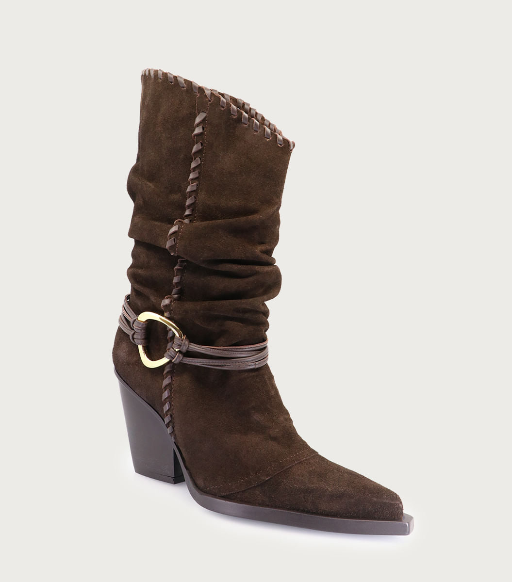Bota Estrid marrón. Texana con caña softy, estribo y detalle de tiento en el borde que aporta carácter al diseño. Forrería de fibras animal friendly y taco de 8 cm que brinda altura con buena estabilidad al caminar.