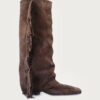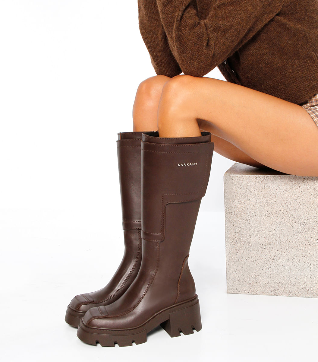 Bota Joey marrón, alta de cuero con recortes y apliques de marca. Calce directo y forrería de fibras animal friendly. Base inyectada. Altura de taco 7 cm. Altura de plataforma 3 cm. Altura de caña 36 cm. La circunferencia de caña en el talle 36 es de 40 cm (la medida varía según talle).