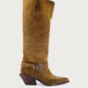 Bota Lezi marrón, texana de cuero. Calce directo y forrería de fibras animal friendly. Base estilo texana. Altura de taco 5 cm. Altura de caña 31 cm. La circunferencia de caña en el talle 36 es de 35 cm (la medida varía según talle).
