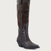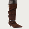 Bota Vitu negro. Alta de cuero gamuzón con puño rebatido y detalle de tiento con herraje media esfera que aporta un acabado distintivo. Forrería de fibras animal friendly, suelín de goma y taco forrado en el mismo material de la capellada que garantizan confort y estabilidad. Altura de taco 4 cm y altura de caña 42 cm. La circunferencia de caña en el talle 36 es de 42 cm (la medida varía según talle).