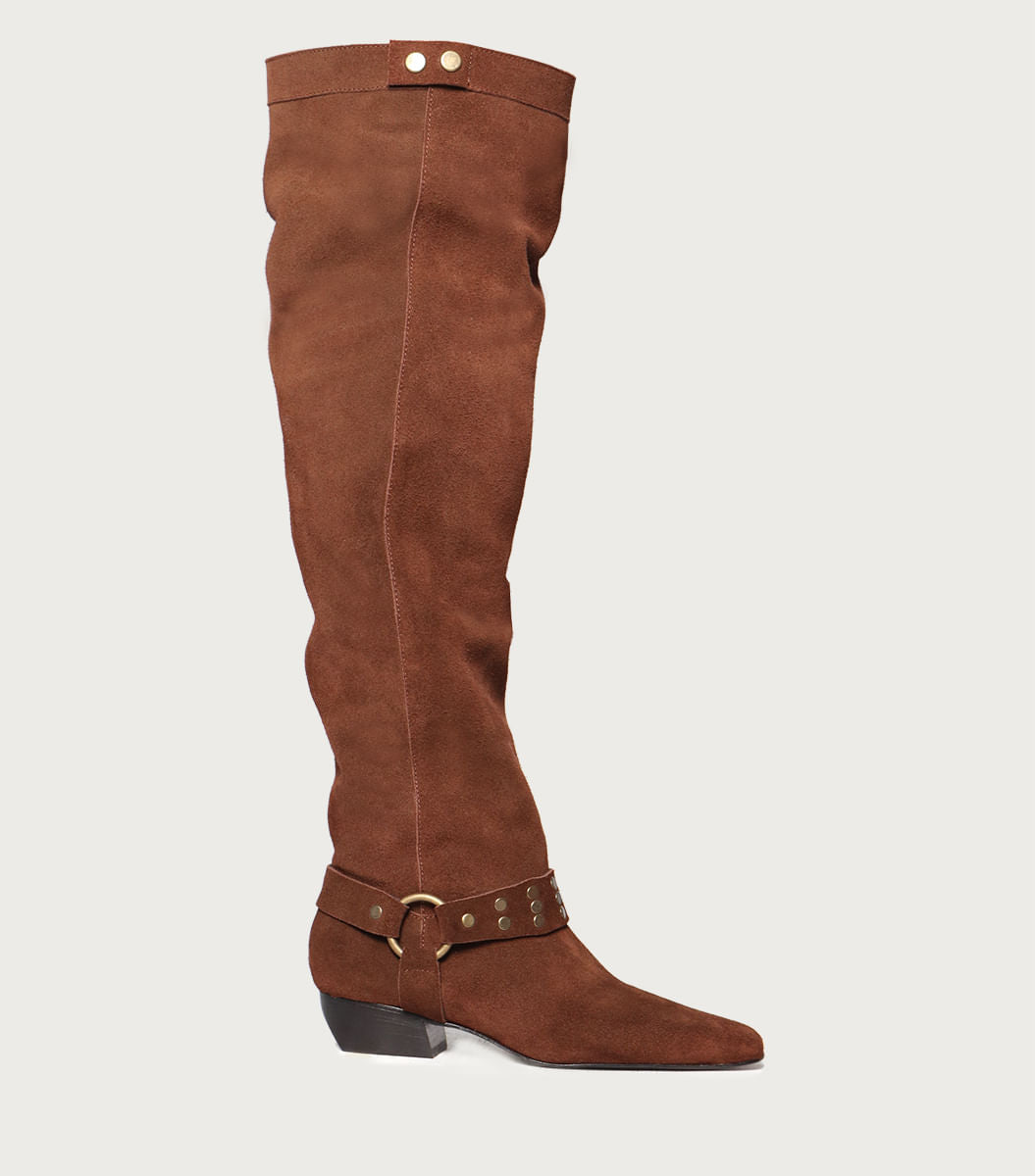 Bucanera Lani marrón. Modelo de cuero gamuzón con estribo que destaca por su diseño y ajuste envolvente. Forrería de fibras animal friendly y taco foliado de 3 cm que aporta comodidad para uso prolongado. Altura de caña 57 cm. La circunferencia de caña en el talle 36 es de 48 cm (la medida varía según talle).